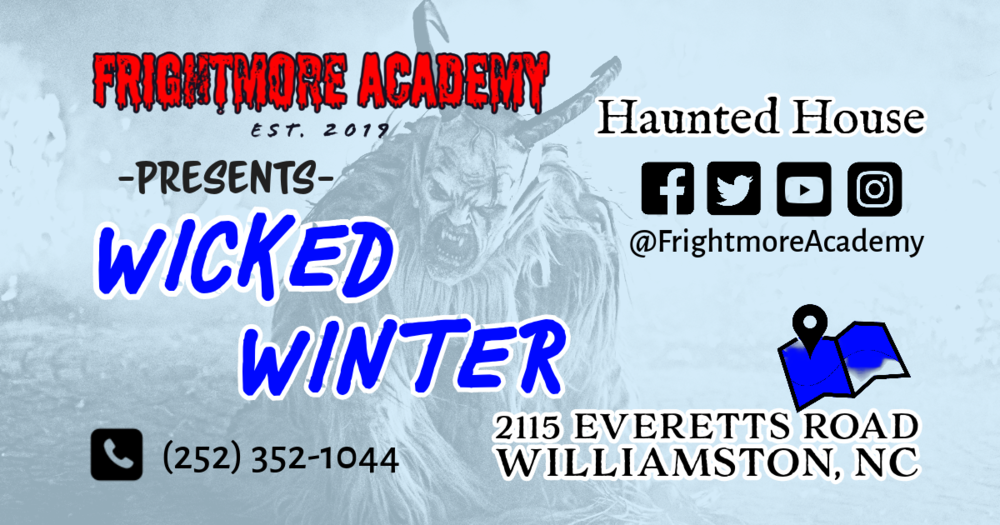 Frightmore Academy is a haunted house which includes 20+ different scenes, both indoor and out. It is not recommended for the faint of heart or those suffering from heart and/or breathing conditions. Visitors will be exposed to strobe lights, fog, and loud noises.